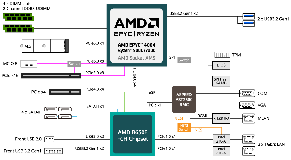 Featuring PCIe 5.0 x16, MCIO 8i, M.2 Gen5, and 4 SATA ports, it provides flexible expansion options. Dual Intel® 1GbE LAN and integrated ASPEED AST2600 BMC enable remote management and reliable connectivity.
