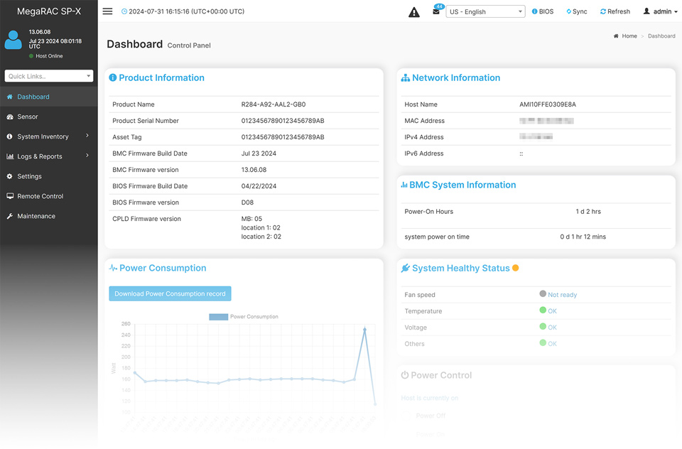 For management and maintenance of a server or a small cluster, users can use the GIGABYTE Management Console, which is pre-installed on each server. Once the servers are running, IT staff can perform real-time health monitoring and management on each server through the browser-based graphical user interface. In addition, the GIGABYTE Management Console also provides:
